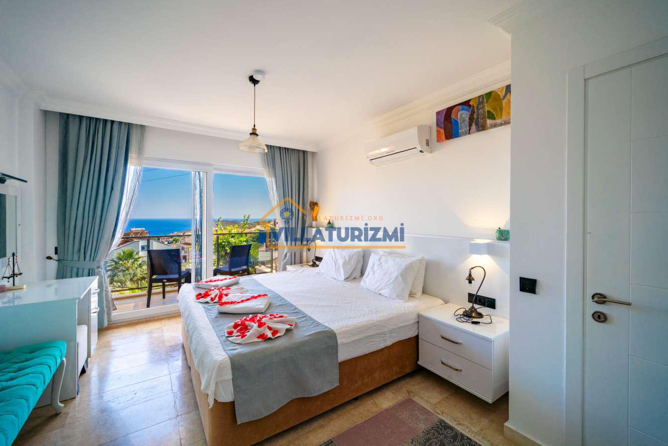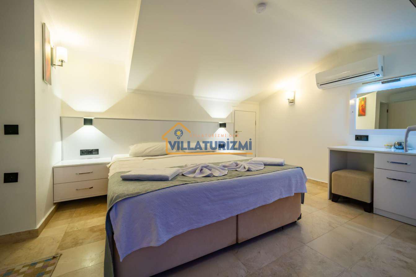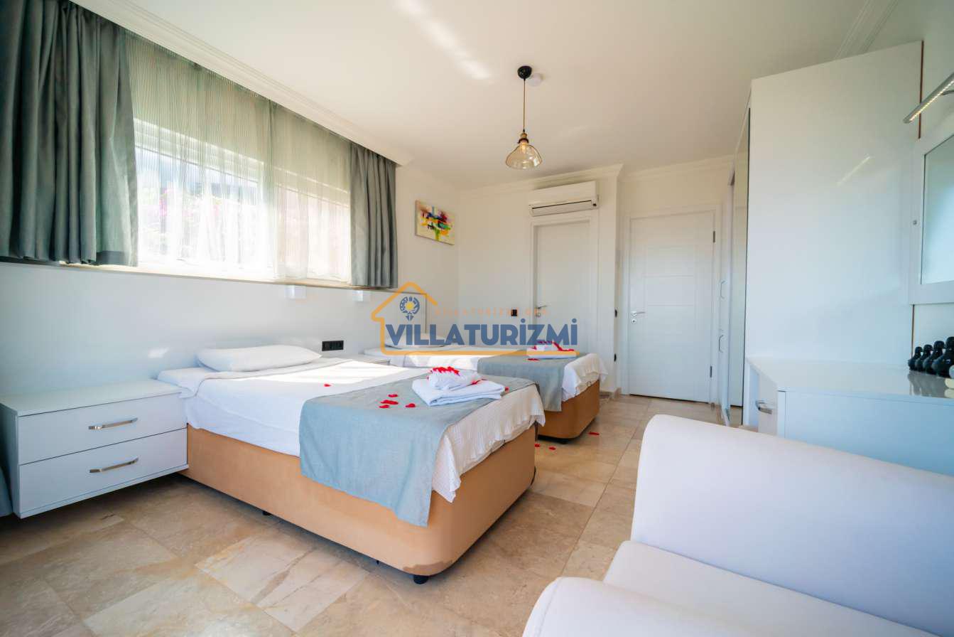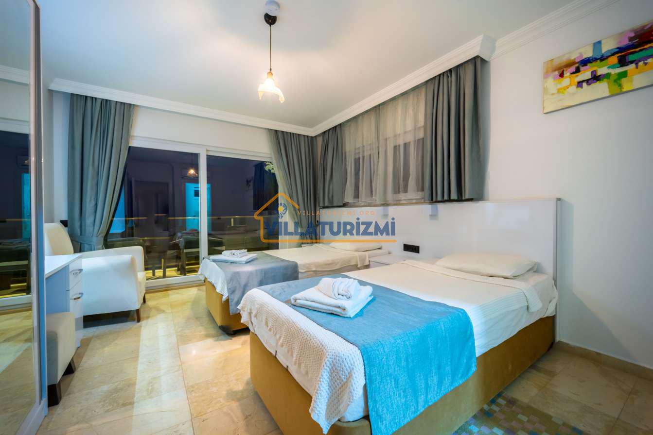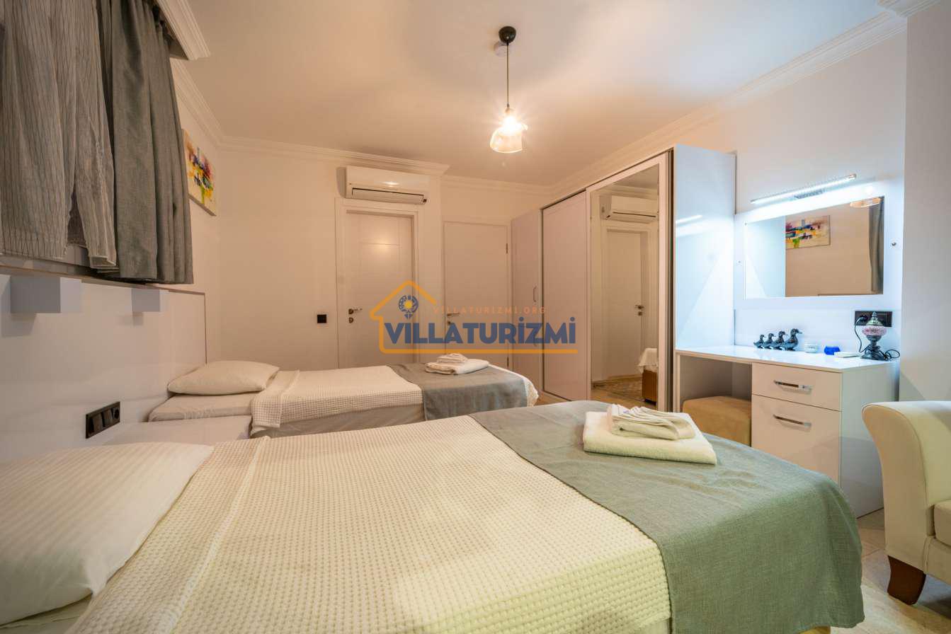 2. Yatak Odası: 1. katta yer almaktadır.2 adet tek kişilik yatak mevcuttur. 1 adet çift kişilik yatak, klima, komidin, elbise dolabı, makyaj masası, saç kurutma makinesi ve banyo bulunmaktadır. Deniz manzaralıdır.