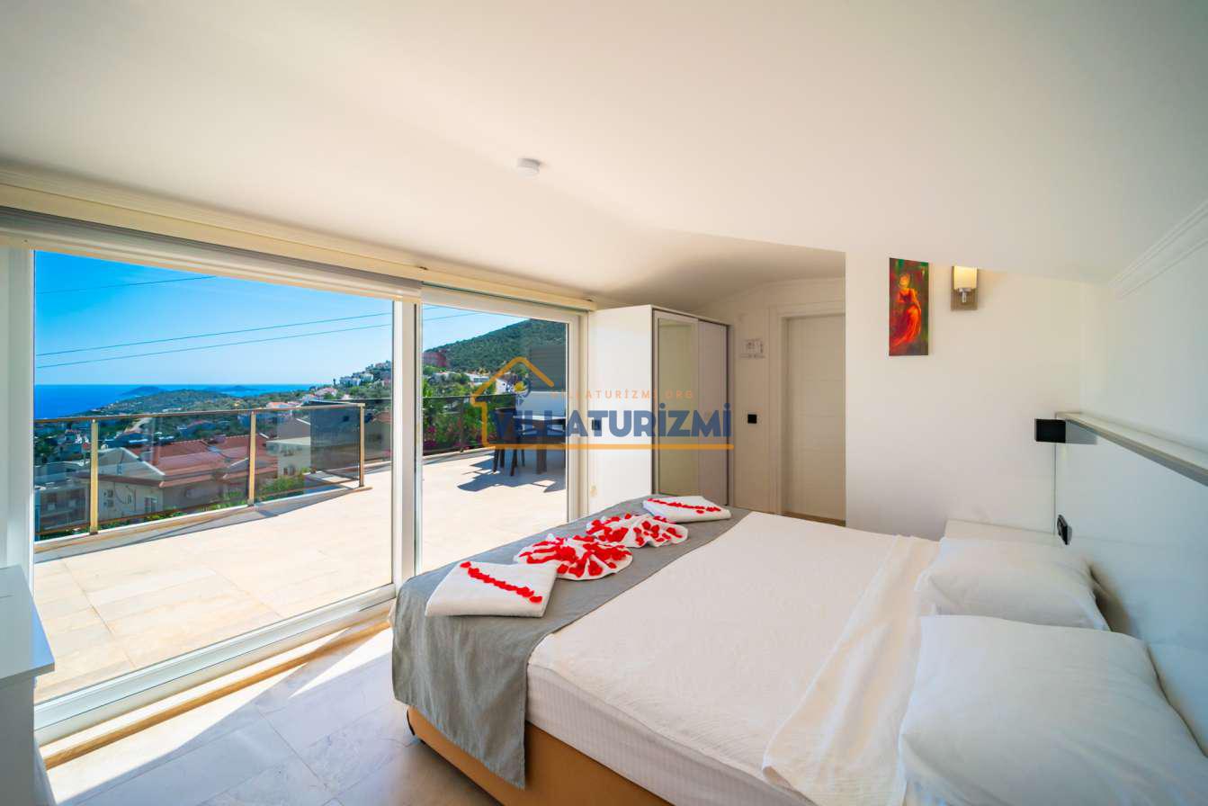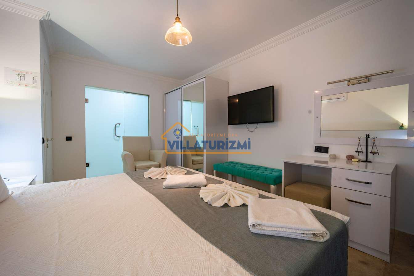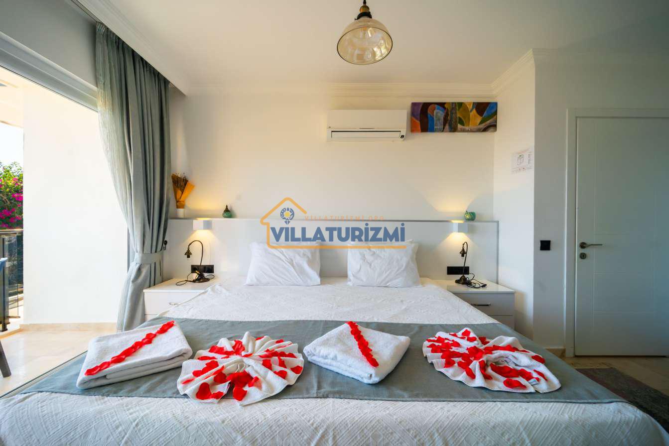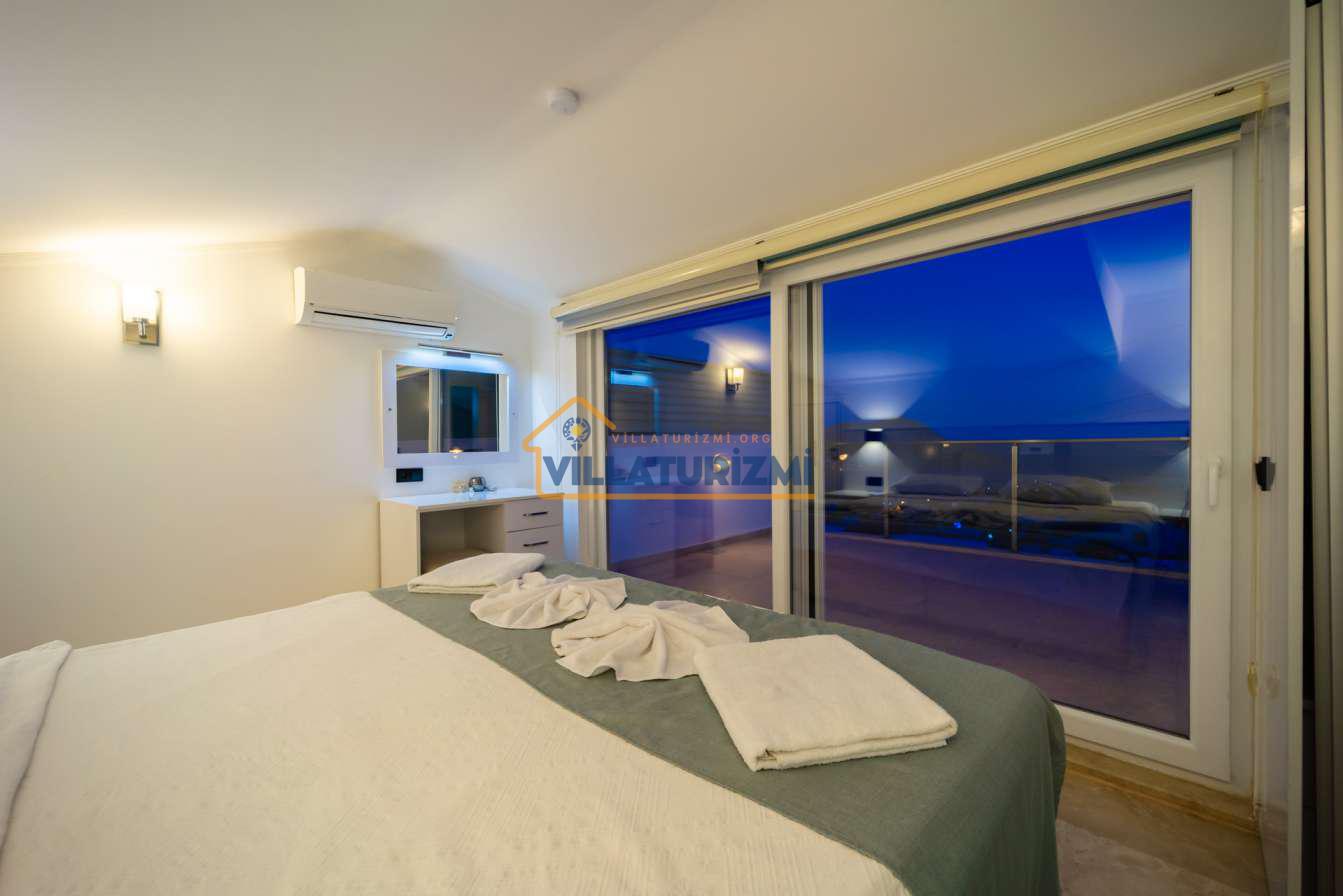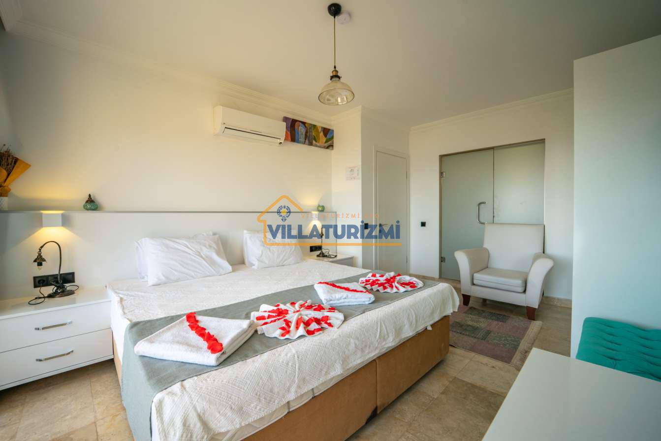 3. Yatak Odası:2. katta yer almaktadır. Suit Aile Yatak Odası 1 adet çift kişilik yatak, klima, komidin, elbise dolabı, saç kurutma makinesi, makyaj masası ve banyo bulunmaktadır. Deniz manzaralıdır.
