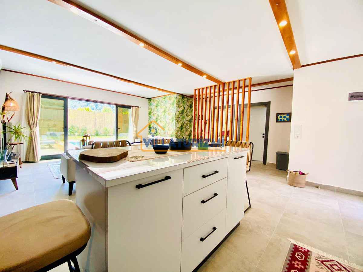 Kiralık Villa Melodika’in mimarisi, modern çizgiler ile yerel dokunun dengeli bir bileşimini yansıtır. İç mekân düzeni, işlevselliği ve estetiği önceliklendirerek planlanmış; ferah ve aydınlık yaşam alanları konfor odaklı bir tasarım anlayışıyla döşenmiştir. İki yatak odası, hem çiftler hem de küçük aileler için ideal bir kullanım sunar. Yatak odalarının konumu ve düzeni, mahremiyeti koruyacak şekilde planlanmış; kaliteli yatak ve tekstil ürünleri ile rahat bir uyku deneyimi sağlanmıştır. Mobilya seçimi ve dekorasyonda ise modern, şık ve sade bir dil tercih edilmiştir; bu sayede konuklar kendilerini hem evlerinde hissedebilecekleri hem de tatilin lüksünü yaşayabilecekleri bir atmosferde bulurlar.