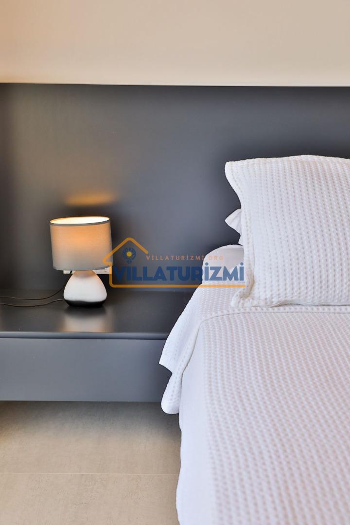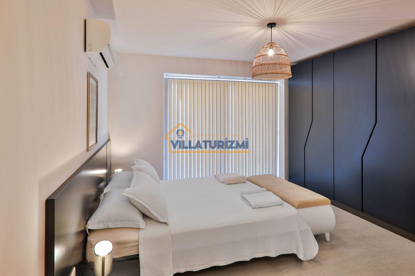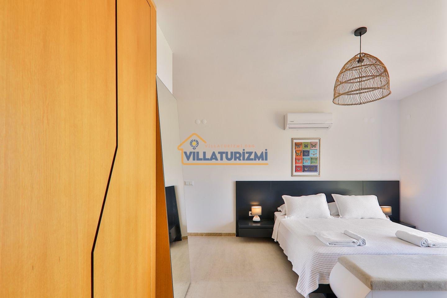 1.Yatak Odası : Deniz manzaralı çift kişilik yatak, yağmur duş, tuvalet ve jakuzi , makyaj aynası , giysi dolabı, komidin, saç kurutma makinası, klima