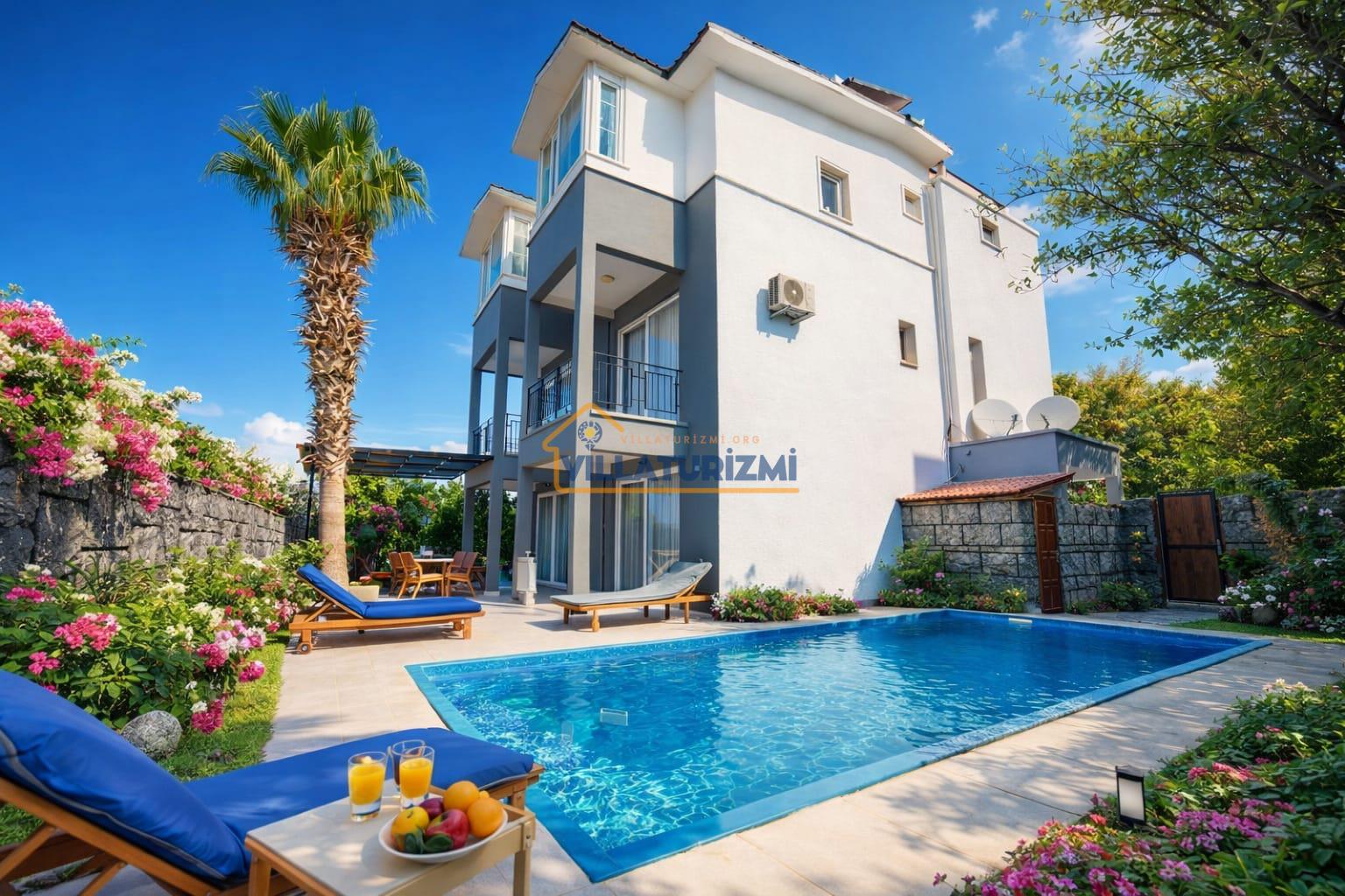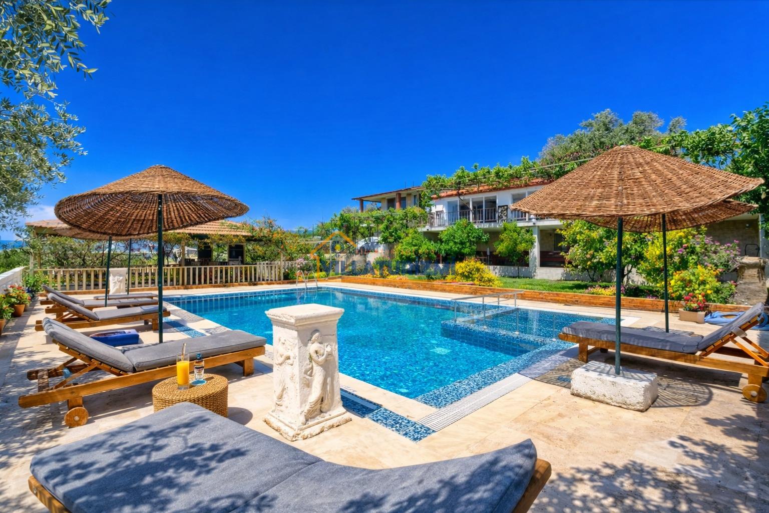 Özellikler: Özel açık yüzme havuzu, güneşlenme alanı, şezlonglar, özel bahçe, özel park yeri ve mangal alanı.