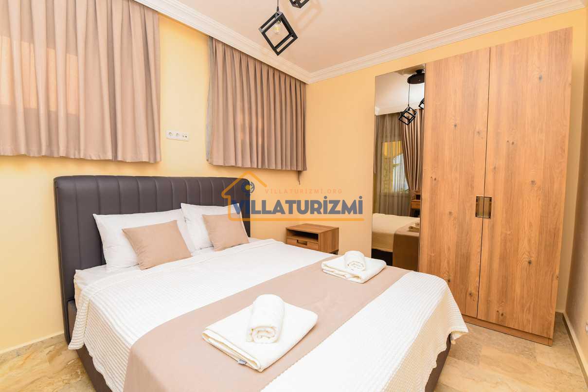 1. Yatak Odası: 1 adet çift kişilik yatak, elbise dolabı, makyaj masası, klima ve banyo yer almaktadır.