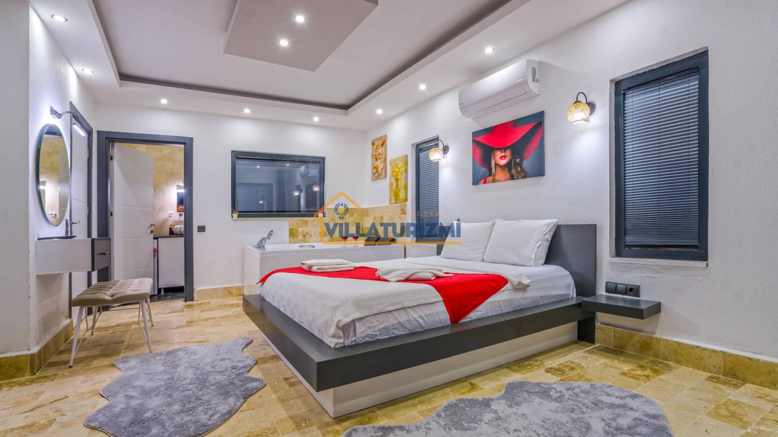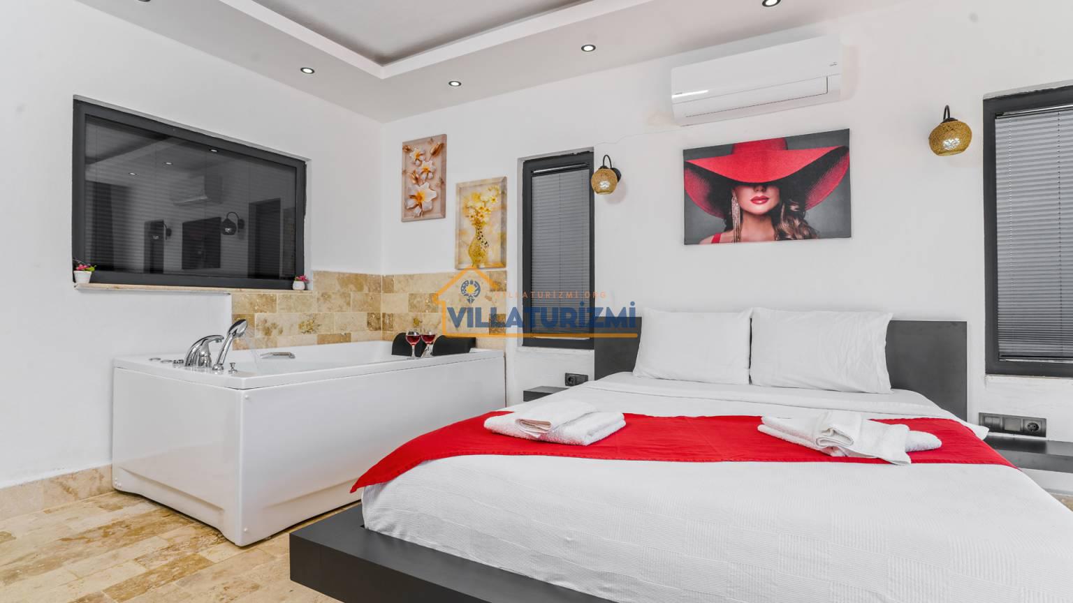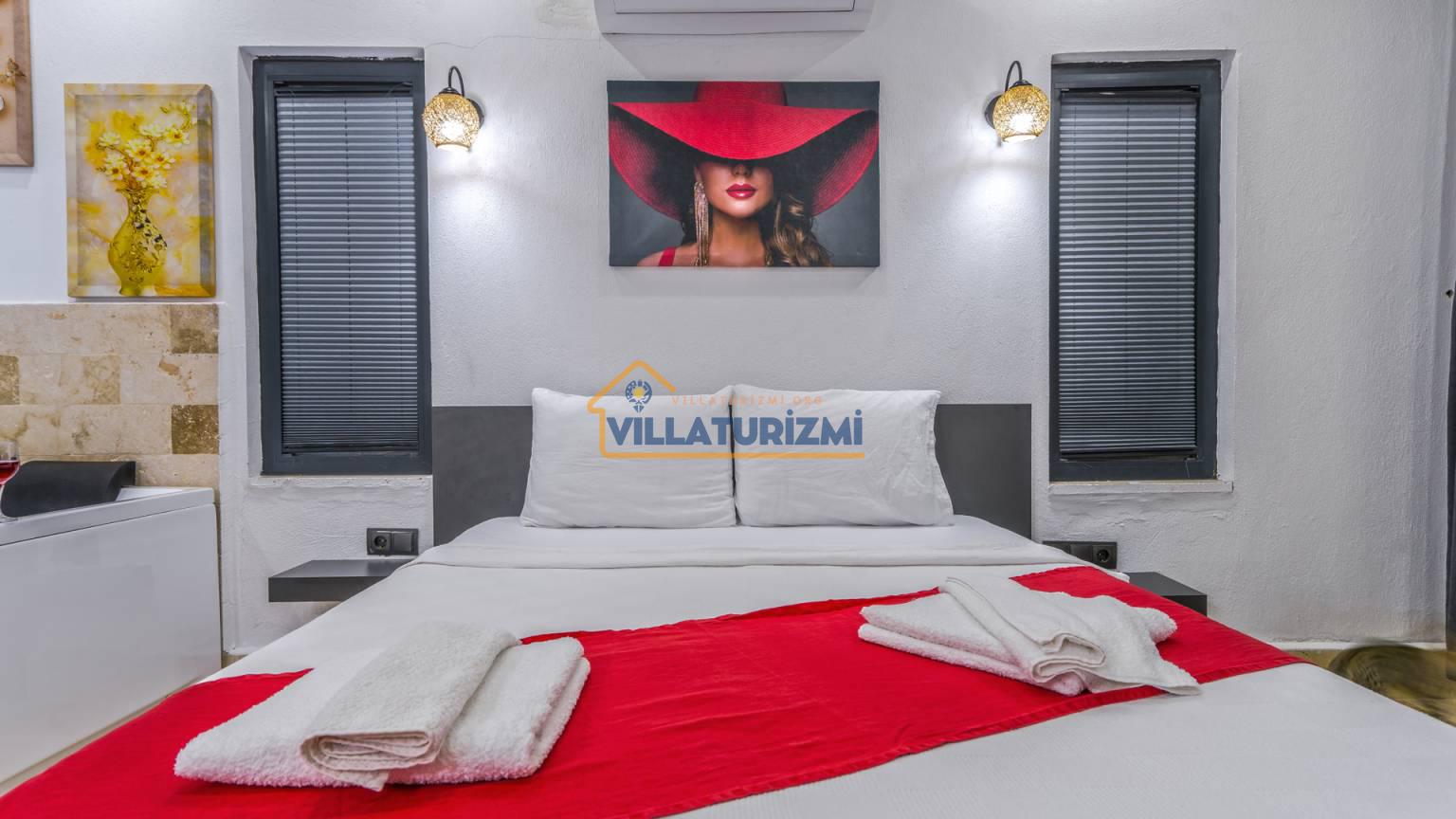 1. Yatak Odası: 1 çift kişilik yatak, klima, komodin, makyaj masası, elbise dolabı, jakuzi ve banyo tuvalet bulunmaktadır.